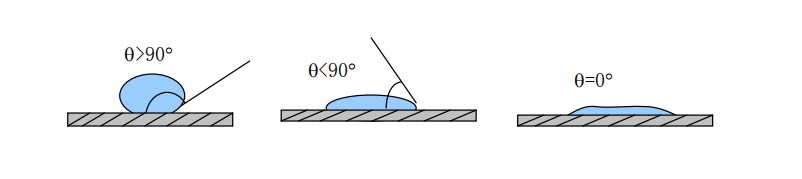 接触角的含义如下图所示,值越大,表明材料越疏水,当等于零时,表明液体(水)能浸润固体表面,以下是一些数据。